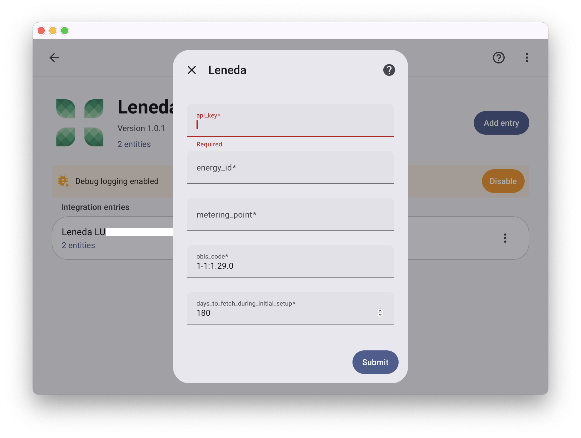 custom_components/leneda folder to your Home Assistant config/custom_components/ directory.